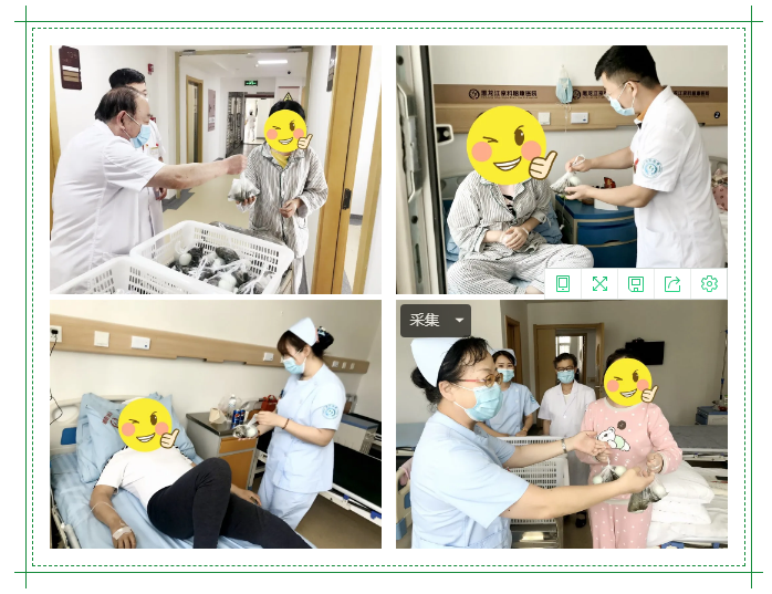 “护士,教教我怎么折?“来,我教你”“这个葫芦太丑了,我要重新折一个,护士长!护士长!看看我折的这个是不是挺好看的”互相交流如何折葫芦,增进了患者间的住院情感,也让患者更好的融入到了活动中去。有个妈妈非常激动“第一次看见孩子这么活泼,玩的这么开心”
